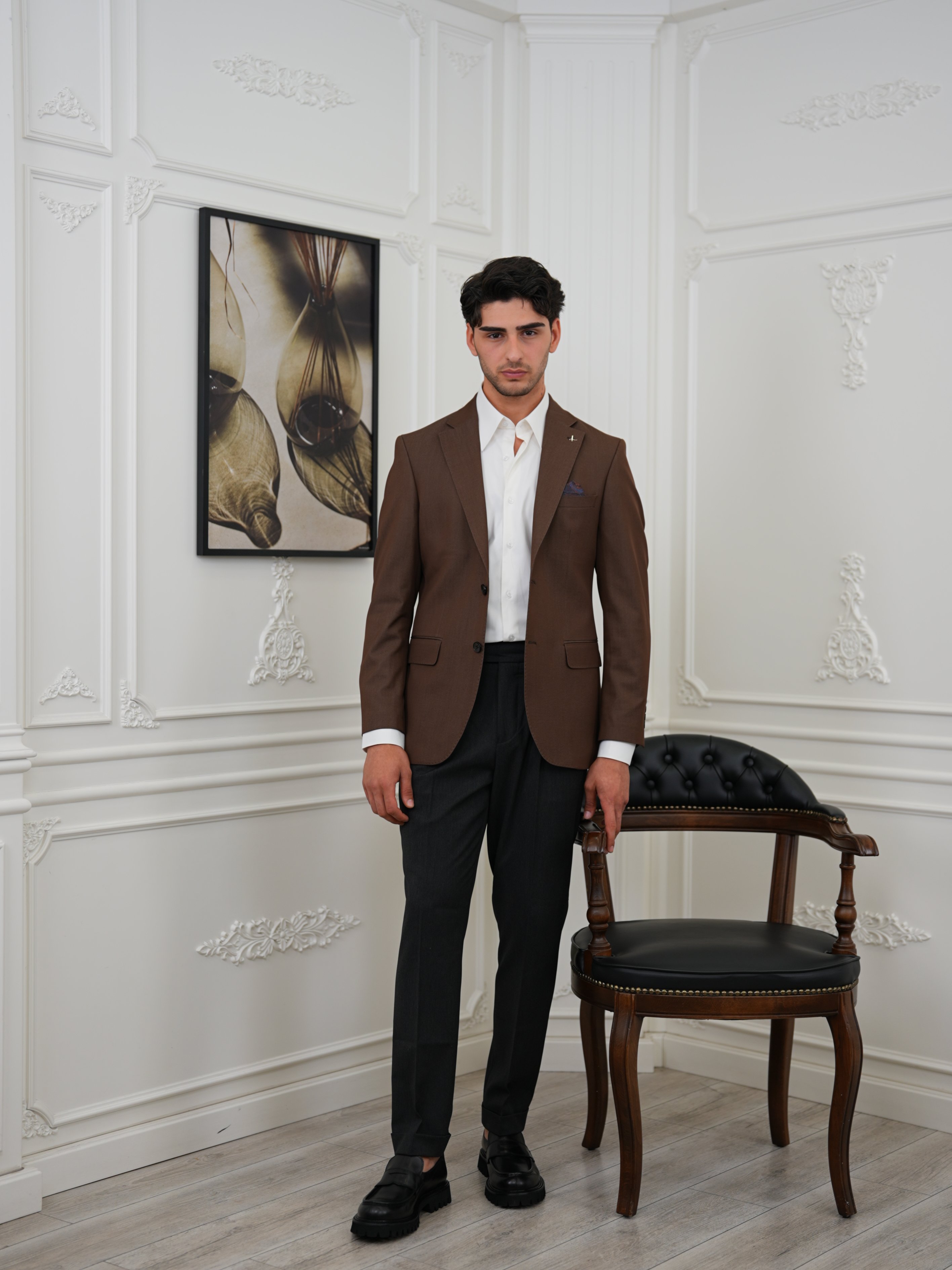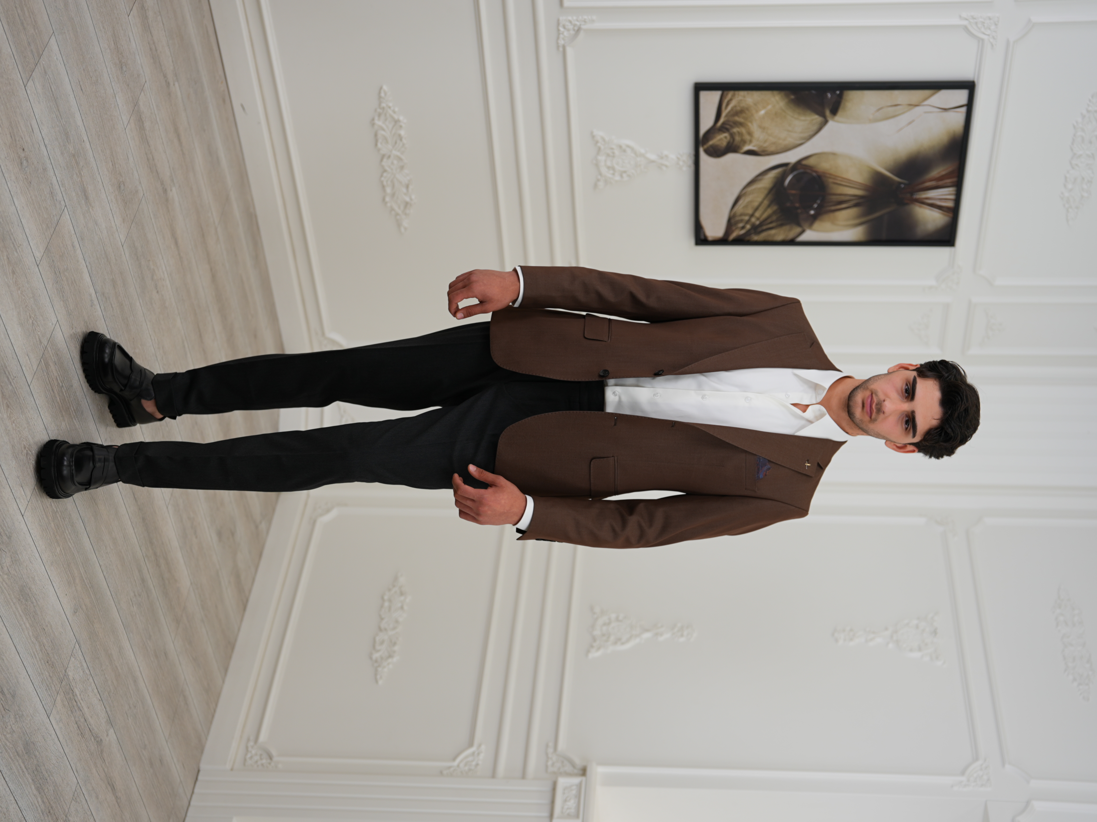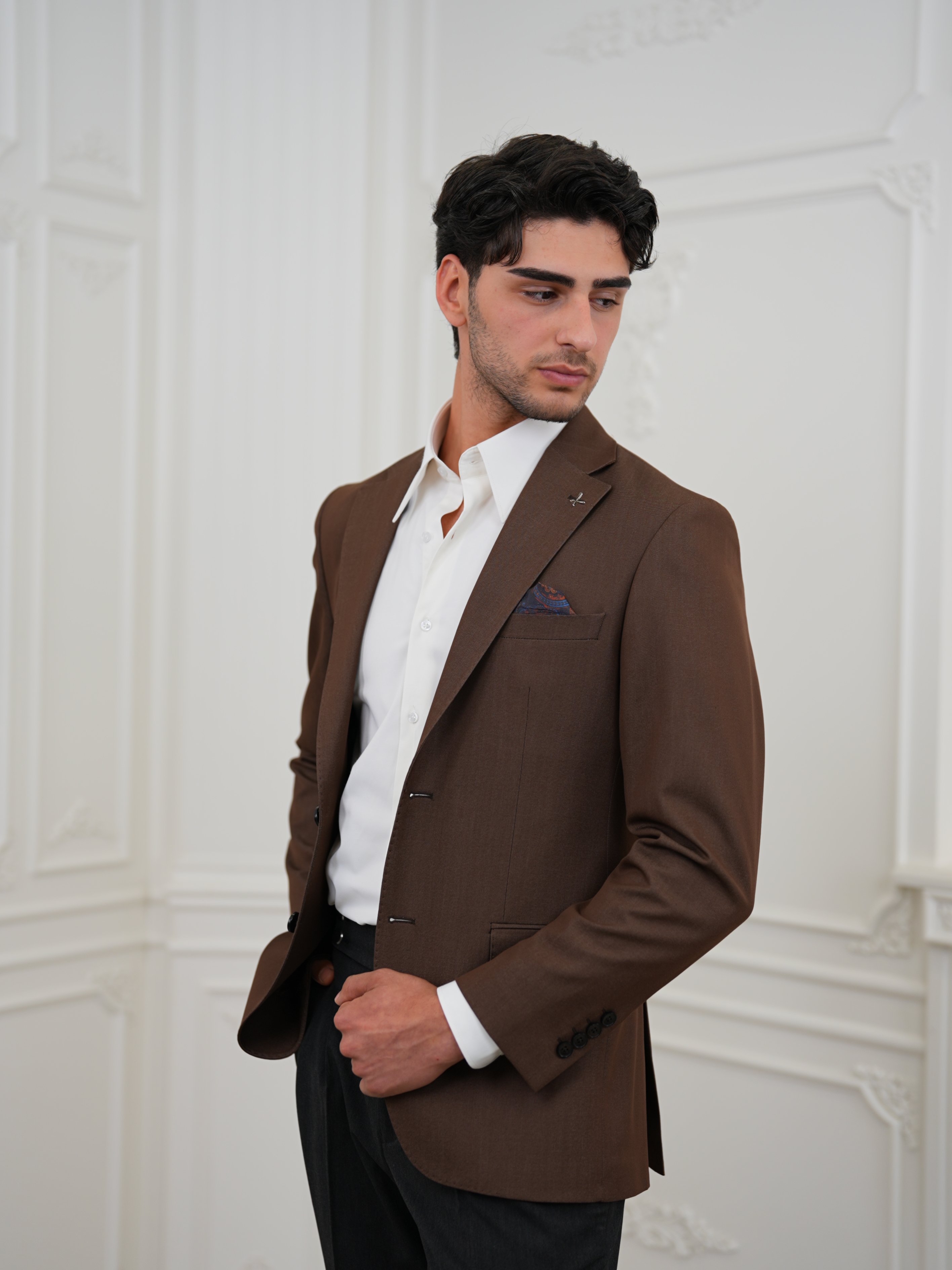 Premium İtalyan Stil Slim Fit Erkek Punto Dikişli Yarım Astarlı Ceket - Kahve (XPRZCOM8330-05)